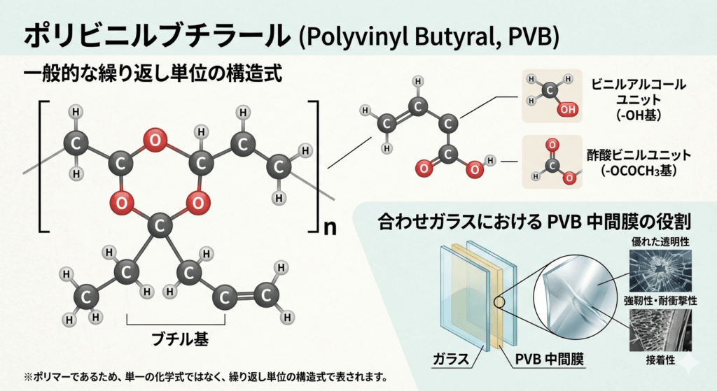 PVB(ポリビニルブチラール)は、安全ガラスの中間膜に使われる樹脂材料として知られており、ガラスとガラスの間にPVBの中間膜を挟むことで様々な効果を発揮します。
